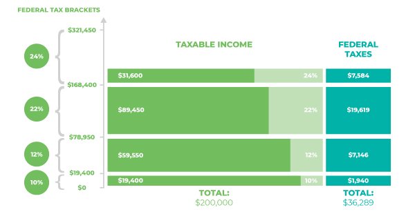 Say a married couple, filing jointly, in 2019, had a taxable income of $200,000. Each dollar over $168,400 – or $31,600 – would fall into the 24% federal income tax bracket. However, the couple’s total federal tax would be $36,289 – just under 20% of their adjusted gross income.