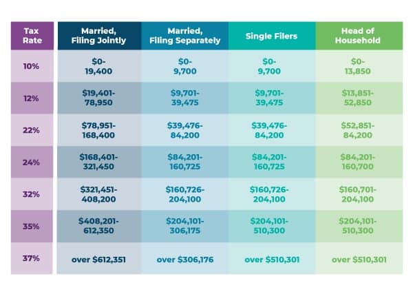 For the 2019 tax year, there are seven tax brackets for ordinary income – ranging from 10% to 37% – and four classifications: single, married filing jointly, married filing separately, and head of household.2